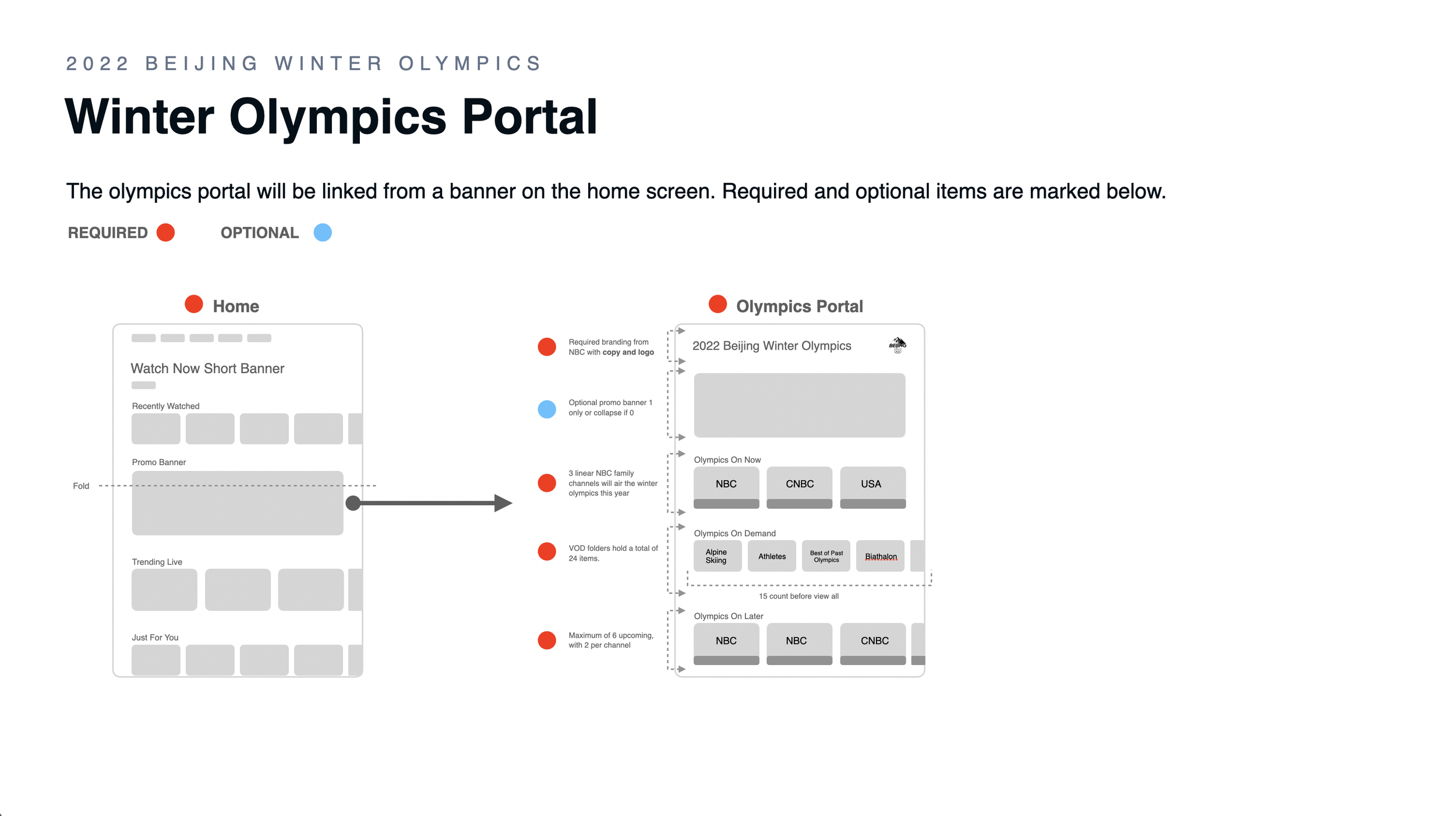 As the lead product designer it was my responsibility to collaborate with the NBC team and Spectrum product leads to formulate a promotional strategy for olympic content on Spectrum TV apps. I would map out flows for potential touch points with the Spectrum TV experience and negotiate with NBC to obtain required marketing materials to meet said goals. My specific duties as a lead were to obtain marketing materials from NBC, tailor them to a 10 ft experience, identify required services and metadata to power our UI components and delegate key art that I modified for TV to dedicated UI designers to create final platform dependent UI.
