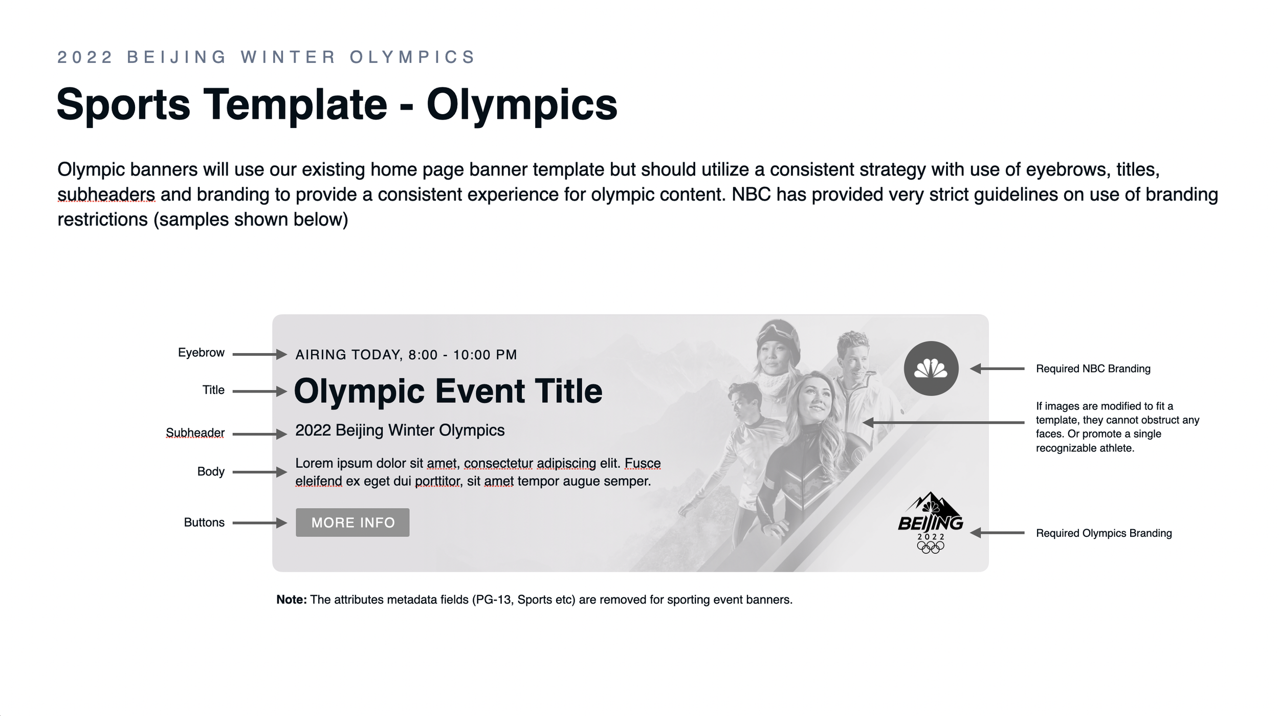 Banners to highlight certain olympic events were used as a key promotional tool. My job was to work with the Spectrum product teams to identify which events would be ideal for promotion and collaborate with NBC to obtain the needed artwork. Since these graphics were not being obtained through Gracenote or any other type of back end service, they had to be manually curated by our team. I would obtain raw marketing artwork from NBC, modify it to fit a 10 ft experience and delegate the creation of final platform specific UI to my team parter Kirsten Lukbert who would take artwork I provided and create the final banners.