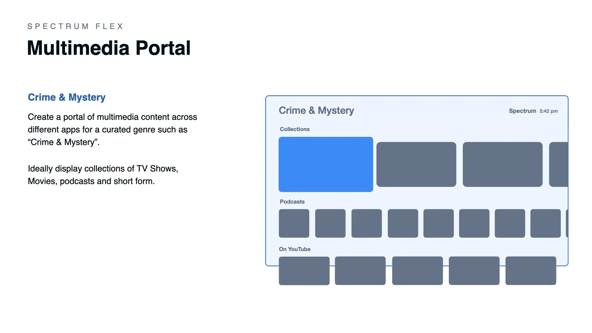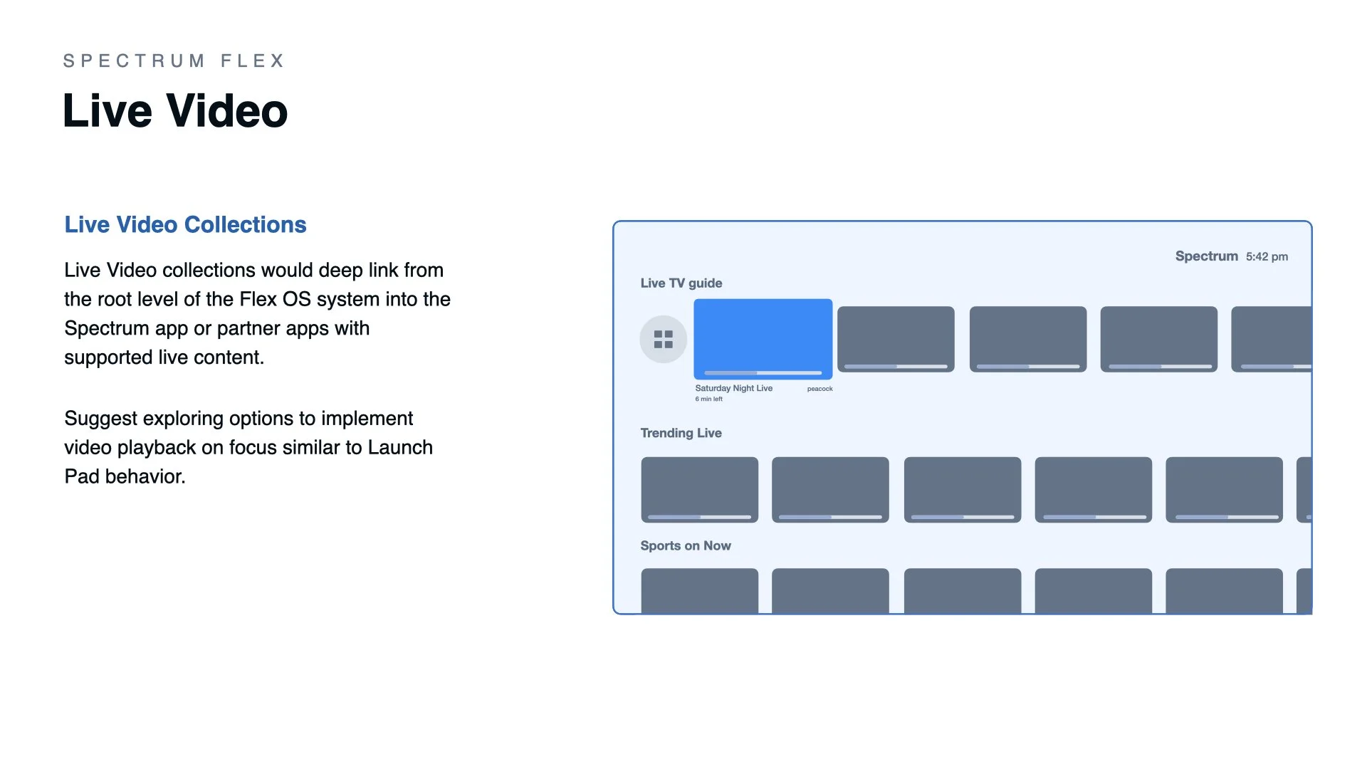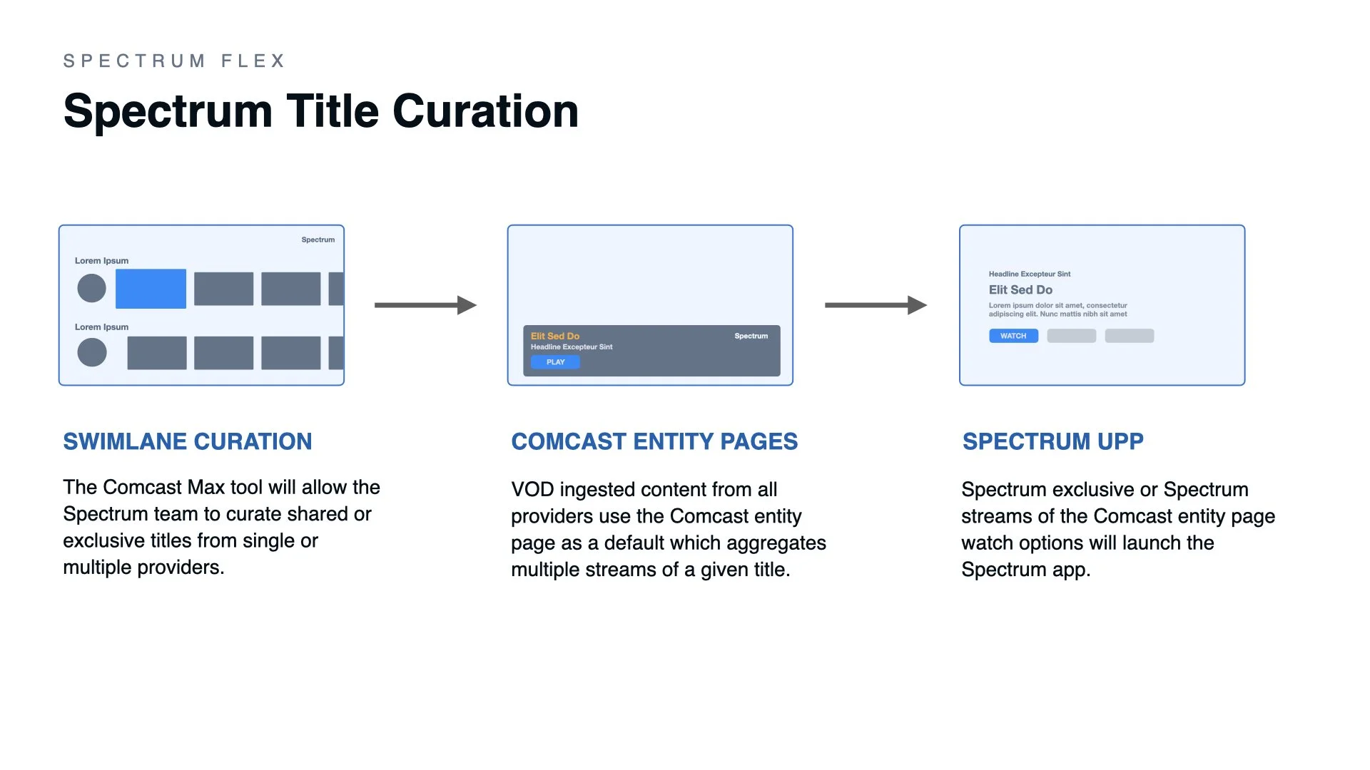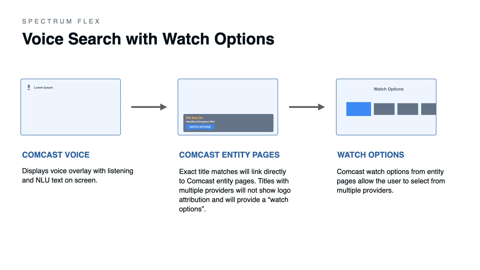 As the lead product designer tasked with creating OTT 3rd party app integration strategies with Spectrum apps I was responsible for mapping the user experience for possible partnerships between Comcast and Spectrum. The Xfinity Flex TV platform is one of various products which Spectrum is actively working on for OTT partnerships in the IP realm.